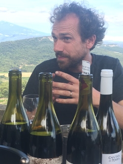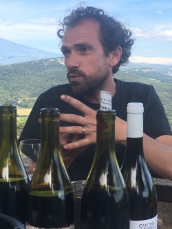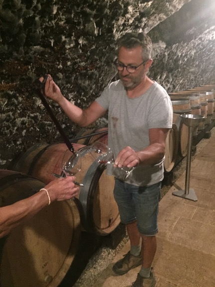 We proeven eerst lekker buiten met als altijd daar een ongeëvenaard mooi uitzicht op de Mont Ventoux, de wijnen op fles. Eerst beide witte, Carlina 18 en Austral 17, geweldige wijnen, onderschat vinden wij, de schilinweking geeft ze een perfecte bite voor bij de vegetarische keuken. Dan volgen de rouges: Ventoux Sur le fil (op het fruit), La Gérine (gul), Les Romanins (compact, helft oogst in 2019), de superbe Sur le Caillou (elegant), Terrres Jaunes 2018 (nog robuust), geurige Costancia (veel syrah van 500m hoog) en uit 2017 de indrukwekkende (want veel verfijnder dan vroeger) topcuvée Le Saint-Martin van 80+ grenache. Thomas vertelt dat op het etiket voortaan staat: ‘bevat geen sulfieten’. Niet legaal (denken wij), gedurfd zeker, als je weet dat druiven tijdens de gisting altijd wat sulfiet produceren. Hij heeft de afgelopen jaren steeds zijn wijnen na botteling laten analyseren, en deze kwamen nooit boven de grens van 10 mg uit. Sowieso tijd voor een proefdoos Ferme Saint-Martin in de gids! Dan gaan we nog half uurtje de kelder in om alle nog niet gebottelde cuvées uit 2019 te proeven.