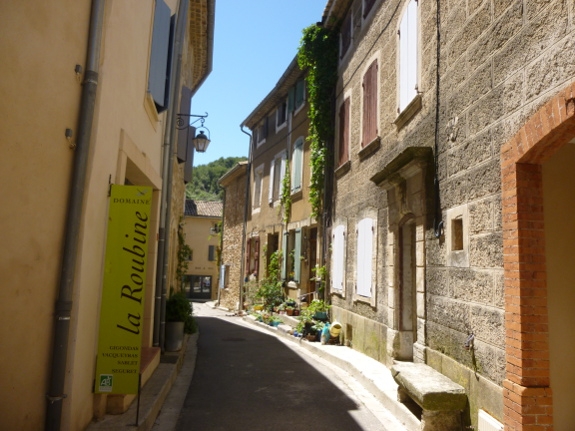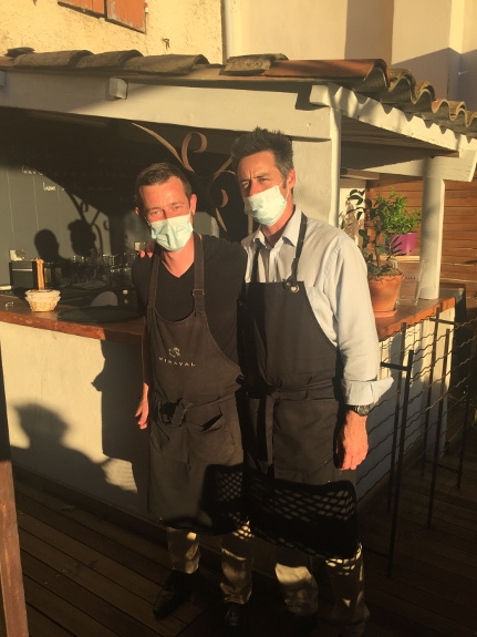 Donderdag is Gigondas-dag… Marc loopt eerst in kleine twee uur door de Dentelles de Montmirail via La Roque d’Alric, Lafare naar Beaumes-de-Venise, waar Tjits hem om 10.30 oppikt. Ook in het bij toeristen zo geliefde Beaumes een merkwaardige rust (terras is leeg), met tegelijk ook die schichtige , masker op, masker af onrust in de smalle straatjes. Eind ochtend bij La Roubine in Gigondas, Eric Ughetto zelf kan niet, iets met een kapotte tractor of zo, maar eega Sophie ontvangt ons in het kleine proeflokaaltje in het dorp zelf. Zij is na Jacques Carillon, de eerste die weer keurig alle protocollen in acht neemt. Veel is er niet te proeven, ze maken maar een paar wijnen…