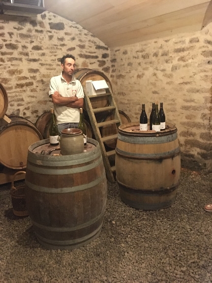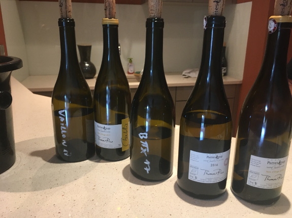 Even later, het is rond midi, blijkt het op de A7 noordwaarts ook lastig rijden, veel terugkerend vakantieverkeer, na Lyon klaart het op en we arriveren keurig om 17.30 bij jonge held Thomas Pico van Pattes Loup. Die, het wordt eentonig, ook in de touwen lijkt te hangen, wallen onder de ogen, continu bijna in slaap vallend. Zijn gezin gaat deze week naar Corsica, hij moet blijven doorwerken, het valt hem allemaal zwaar, de verantwoordelijkheid voor tien man personeel, de nog altijd gespannen verhouding met zijn vader, het ternauwernood voorkomen van breuk in zijn relatie. Hij is er ontwapend openhartig over, is verbaasd om te horen dat wij elkaar veertig jaar kennen en dat Marc de 60 al ruim is gepasseerd, dat Vinoblesse volgend jaar –si tout va bien– vijfendertig jaar bestaat…. We proeven de (gewone) chablis 2018 (royaal en makkelijk) en 2017 (klassieker, meer concentratie) naast elkaar. Voortaan staat het sulfietgehalte keurig exact op het etiket vermeld, zoals bij onze Cantina di Torra (Corsica). Zou standaard moeten worden, alleen de (verplichte) vermelding ‘bevat sulfieten’ is in feite desinformatie in stand gehouden in belang van sulfietgrootgebruikers (zie ook de nonsens, desinformatie hierover in de laatste Allerhande)… Vervolgens passeren Vaillons 2018, Butteaux 2016, Butteaux 2017 en Beauregard 2017 de revue: wat een wijnen, en met een drinkbaarheid en natuurlijkheid die we graag in meer (alle?) witte bourgognes zouden willen zien…!