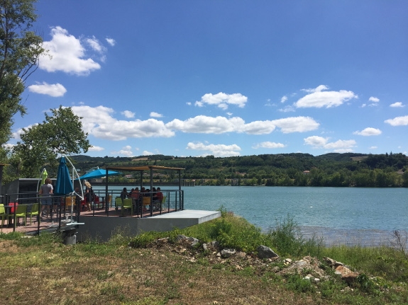 Zaterdag 11 juli hebben we op weg naar het zuiden Clusel net voorbij Lyon en Combier vlak voor Valence op het program. Het laatste waar we rekening mee hebben gehouden is een soort van zwarte zaterdag op de weg…, veel Fransen blijken met feestdag 14 juillet op dinsdag een lang weekend, of zelfs hele week vakantie genomen te hebben. Als we oostelijk langs Lyon ploeteren, horen we op de radio dat je er nu vijf (in plaats van twee) uur erover doet om van Lyon bij Orange te geraken. Er zijn ook nog wat ongelukken gebeurd, navigatie-app Waze gidst ons over de meeste vreemde sluipweggetjes, onder, over, langs en tenslotte weer óp de A7…. Even voorbij Vienne, vlak voor geplande aankomst bij Clusel-Roch gaat het mis, de borden boven de weg gebieden hier la sortie Ampuis te nemen, probleem: er zijn maar twee tolpoortjes. De tijd tikt weg, Clusel gaan we niet meer redden, over de laatste 2 km doen we ruim een uur. Als we eenmaal door de poortjes zijn, maar even bijkomen met een sandwich aan de oever van de verrassend blauwe Rhône.