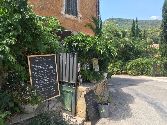 De witte sablet is een leuke curiositeit. Rood is hier niet voor de zomer….: onder de 15% zitten ze niet. Sablet 2018 charmeert direct, gul omarmend zacht, kruidig, rijk maar net niet zwaar, de vacqueyras toont zich stuk gereserveerder, wel veel garriques in de smaak, de gigondas combineert die twee: ongelooflijk rijk en rijp (ze plukken altijd het laatst van de hele appellation), aroma’s van kirch, chocola, tijm, zwarte peper… Ze raadt ons het restaurantje A l’Ombre des Dentelles aan het eind van het dorp aan voor de lunch. Goede tip! Prettige bediening, de lekkerste gefrituurde aardappelschijfjes (bij de salade) ooit, milde prijzen, ook voor de wijnen (€ 2,- voor glas sablet blanc La Roubine). We komen terug.