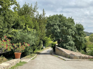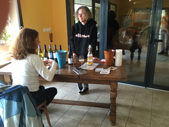 Eerst een rondleiding door de oude Mas, een klassieke ooit zichzelf bedruipende boerderij van hier met plaats voor schapen, kippen, paarden, een enorme groentetuin, eigen waterput, en evenveel grond voor olijfbomen als voor wijngaarden. We staan in tot keuken, badkamer en opberghok getransformeerde, ondergrondse, cuves uit de 16e eeuw, waarin de wanden met de originele kleurige geglazuurde tegels nog in tact zijn. We proeven rood, wit, rosé van (veelal cementen) cuves, de wijnen die in aanmerking komen voor bag-in-box emballage. De wijngaarden zijn in officiële, dus gecontroleerde overgang naar bio. Daarna komen de wijnen op fles aan bod, waarvan de meest simpele, zonder opsmuk, ons het meest bekoren.
