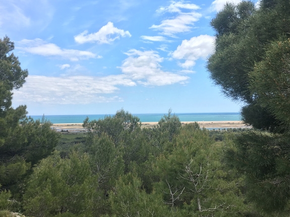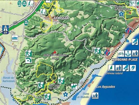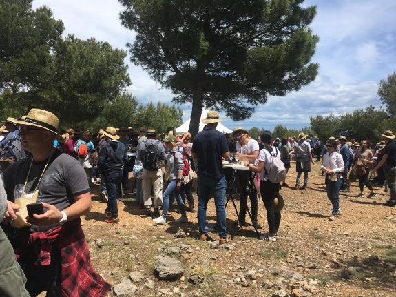 Dankzij Christophe Bousquet, président van La Clape, kunnen we zondag nog meedoen aan de jaarlijkse gastronomische, vineuze ballade Les Sentiers Gourmands de la Clape door het beschermd natuurgebied van La Clape. De 1500(!) startbewijzen waren in maart binnen een paar dagen weg, dus er moest wat geritseld worden. Als we de auto parkeren op een veldje bij het beginpunt (Chateau Le Bouis) krijgen we alvast een blaastestpijpje voor na afloop… Het blijkt een prachtig parcours van 8.5 km slingerend door geurige pijnboombossen, bedwelmende garriques en verscholen wijngaarden. Ideaal weer, zonnig, niet te warm, stevige frisse wind uit de bergen. Na elke van de vijf etappes, een pleisterplaats waar een mooi gerechtje (van diverse chefs) verkregen kan worden en een vijftal wijnen te proeven zijn. Dit is echt zó Frans: un dimanche à la campagne waarbij hele gezinnen, groepjes vrienden, stellen van alle leeftijden goed gemutst genieten van het buiten zijn, relaxt bewegen, de vele wijnen en natuurlijk van al het eten. Bij de een-na-laatste stop, die met de fromages, is menigeen goed en vrolijk aangeschoten: wijn uitspugen, dat is alleen iets voor professionals als wij. Aan de gezamenlijke tafels raken we in gesprek met onder meer een groep uitgelaten dertigers werkzaam bij Airbus in Toulouse, Parijzenaars, lui uit Lyon, een Corsicaan die onmiddellijk uitlegt in welke restaurants we moeten zijn (we gaan begin juni daar op wijnpad) en hoe daar te komen. We hebben het niet precies onthouden.