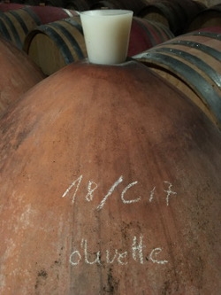 We landen met de gebruikelijke vertraging eind donderdagmiddag, huurauto en wroem, wroem richting ‘onze’ heerlijke Auberge du Cèdre in de Pic Saint-Loup, een kleine drie kwartier rijden. Koffers op de kamer en gelijk naar Clos Marie even verderop. Christophe Peyrus oogt wat vermoeid (hij was al om 4.00 uur op) maar tegelijk energiek en relaxt. Fijn om bij te praten, samen te proeven, en zo als altijd een hoop op te steken. Ook hier nu twee (grote) bovengrondse amfora’s, waar een deel van de Cuvée Olivette wordt opgevoed. Christophe gebruikt een in feite eeuwenoude methode om de (rode) wijn te maken. Hele niet ontsteelde trossen (grappes entières), afgewisseld met hele trossen die wel van takjes ontdaan zijn, en dan laagje voor laagje, als millefeuille, bladerdeeg. Na twee financieel lastige jaren (geen oogst 2016, halve in 2017) is de ruime (behalve bij Métairie du Clos) en goede oogst 2018 meer dan welkom. Wijnen die blaken van de energie, écht Clos Marie.