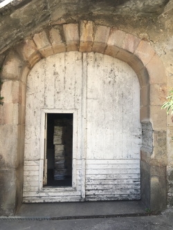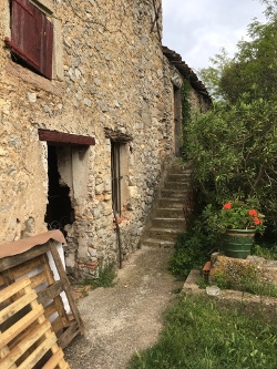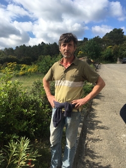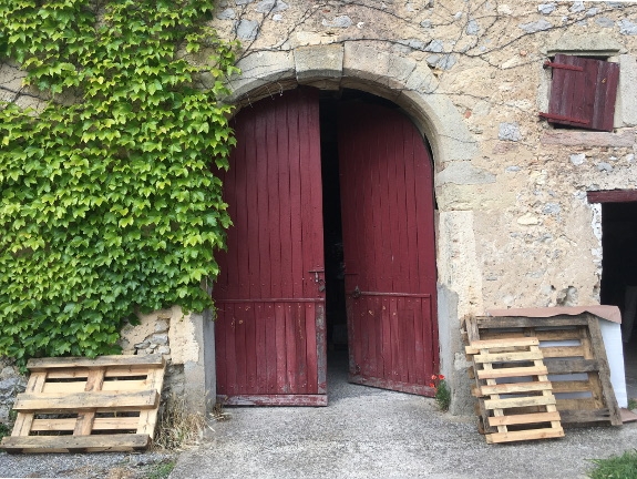 We vliegen maandag pas halverwege de middag terug, dus ’s ochtends tijd voor nog een bezoek. Vanuit onze chambre d’hôtes La Ramade (mooi en rustig, maar wat doods) in La Clape gaan we naar het ruige hart van de Corbières, waar iets ten zuiden van het schilderachtige middeleeuwse stadje Lagrasse, onze Dominique Terrier (ex-Deux Anes) is neergestreken voor een nieuw, eigen avontuur. Hij heeft twee jaar geleden 6 ha (biologisch gecertificeerde) wijngaarden kunnen overnemen, maar heeft er nu 17ha in beheer, ‘gratis’ gepacht van buurboeren die het fijn vinden dat er iemand is die zich erom wil bekommeren. Maar 17 hectares in je uppie: Dominique vindt het ook iets te veel van het goede. Hij mag de oude kelder van het verder onbewoonde, en deels tot gites verbouwde Chateau Saint-Auriol gebruiken, heeft tweedehands apparatuur en cuves op de kop getikt en eigenhandig een knusse houten cabane (hut) gebouwd om in te wonen. En inmiddels zijn de eerste wijnen er….! Vooral de witte, de een Vin de France 2018 van 100% viognier, de ander Corbières Blanc van marsanne, roussanne bevallen ons, mooie, volle, stabiele vins nature, van de rouge 2018 wachten we op tweede botteling begin september. De eerste van eind maart was gewoon te vroeg, de stuurse oude carignan in deze wijn heeft echt meer tijd nodig, erkent Dominique ruiterlijk.