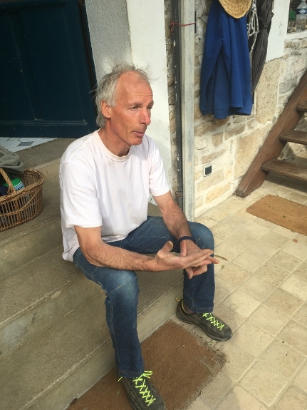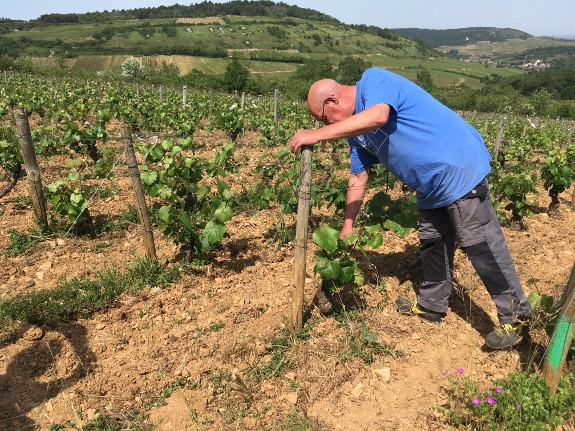 Half drie alweer in Saint-Aubin, bij biodynamische monnik Pierre Fénals van En Belles Lies. Pauvre Pierre: vorige week kukelden drie pallets wijn van zijn vorkheftruck. Alles kaduuk. Ai. Hij is (nog) niet te spreken over 2018, de wijnen missen (nog) leven, energie, normaal juist de handtekening van En Belles Lies. Bij sommige wijnen kunnen we dat beamen, bij andere zoals L’Etrange (oude gamay, pinot noir op 400m hoogte) en de aloxe-corton valt dat reuze mee. We gaan nog even de wijngaard in, hoog boven Saint-Aubin als je het slingerweggetje naar La Rochepot neemt. Geen wijnburen daar, wel zo fijn en geruststellend als je minutieus (alles handmatig) biodynamisch werkt.