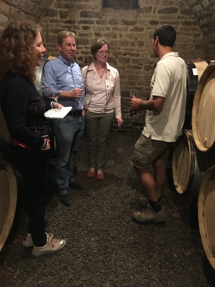 Na een snelle koffiestop naar Jean-François en Sophie Germain, Rue des Forges 4 Meursault… We kletsen eerst wat bij, JF laadt nog een pallet in camion voor Engelse importeur, en we gaan zoals al vierendertig jaar te voet naar de kelder een paar honderd meter verderop. Ze zijn bezig een nieuwe kelder voor de flessenopslag te graven. We kunnen goed een dwarsdoorsnede van de bodem zien, grint bovenop, dan stevige laag compacte klei, daaronder kalkrots. De bourgogne blanc en rouge komen grotendeels hiervandaan. Eerst twee uur lang de fustendans 2018. Wederom: chapeau Jean-François. Wat een goede wijnen. Rood is net als elders wat lichter dan 2017, maar mooi in balans, vol en zacht met niet te veel alcohol en voldoende zuren. De negen witte (met speciaal hartje voor 1er cru Les Charmes) zijn stuk voor stuk uitmuntend. JF zet ons nog gniffelend een experiment voor. Vier vaten blind proeven. Hij vertelt niet wat er in zit, evenmin waar we op moeten letten. De verschillen zijn niet groot, maar wel duidelijk. Het blijkt om dezelfde ‘gewone’ meursault te gaan maar dan met vier verschillende hoeveelheden sulfiet en manier, moment van toevoegen. Die helemaal zonder, vat 4, heeft wat vluchtigs maar is verreweg het zachtst. Die met het meeste is behoorlijk reductief. Is natuurlijk een momentopname, over een maand kan het weer anders zijn. Op advies van dochter Lucie (volgende, voor ons al derde generatie kondigt zich al aan) gaat hij ze apart bottelen. Zo komen we verder. En spannend om de serie over paar jaar nog eens (blind) te proeven. Van 2017 (dit najaar) is de Chevalières, ofschoon net op fles, al erg verleidelijk. De Beaune-Bressandes 2017 is groots.