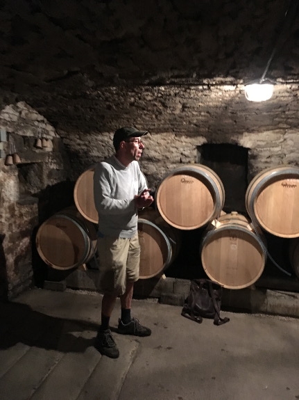 We slapen goed en de volgende ochtend staan we om 9.30 bij Vincent Dauvissat in de kelder. Hij is voor zijn doen relaxt, praatgraag, en heeft geen haast. Content over de riante oogst 2018, het op beetje nachtvorstschade na, de gezondheid van de wijngaarden nu in 2019. Een jong Australisch stel, waarvan hij wijnmaker, proeft mee. Eerst de hele serie 2018 van petit chablis tot grand cru Les Clos van het vat, onlangs overgestoken en beetje gezwaveld, dus nu niet optimaal in vorm. 2018: hoge opbrengsten (boven ‘plafond’, dus overschot moet gedestilleerd en mag niet ‘verrekend’ worden met tekorten van 2016 en 2017….), stevig qua alcohol (13%-14%), gecompenseerd door mooie zuren en voor al zijn chablis zo kenmerkende mineraliteit. Nieuw (sinds een paar jaar) is de 1er Cru Montée de Tonerre, fijn en crémeux, waarna broer 1er cru La Forest zich juist stevig en volumineus toont. De grands crus Preuses en Les Clos zijn aristocratisch, misschien wel monumentaal, Vincent vergelijkt 2018 met legendarische jaren als 1947 en 1959.