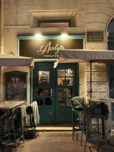 Op zaterdag om 10.15 stipt op tijd vanaf Amsterdam CS in de Thalys naar Parijs, ook aankomst op Gare du Nord 13.40 is volgens het spoorboekje, moet ook: we hebben amper vijf kwartier voor de overstap naar Gare du Lyon, maar dat blijkt een fluitje van een centime met RER ligne D. En om 14.54 begint het (maar drie uur) zoeven naar Montpellier in de TGV INOUI (betaalbaar als je ruim van te voren boekt, ook eerste klas) die als eindbestemming Barcelona heeft. Als we Montpellier naderen een sms van de SNCF: terugreis van dinsdag is gecanceld vanwege aangekondigde stakingen. We kunnen ons geld terugkrijgen of zelf een ander ticket zien te vinden. Grrr, lastig op je mobiele telefoon, meeste treinen zitten natuurlijk al vol, maar het lukt, betekent wel een dag later naar huis. Het nieuwe TGV-station buiten Montpellier is tikje onhandig, er is geen directe verbinding met le centre ville, we nemen een (thuis al gereserveerde) elektrische taxi. Chauffeur François blijkt een aardige kerel, we boeken hem gelijk voor zondag (scheelt weer een huurauto) om naar de offs (buiten Montpellier) te gaan en met vooruitziende blik ook voor dinsdag (naar beurs) want dan rijdt de tramway naar Parc des Expositions ook niet. Goede zet, blijkt als dinsdag er geen taxi meer te krijgen is. We slapen in rustig straatje achter Gare Saint-Roch, vandaar makkelijk het oude centrum in. Traditiegetrouw eten we (reserveren noodzakelijk) eerste avond in wijnbar L’Acolyte. Niet hoogdravend, maar goed, vers en met leuke wijnen. Attente bediening en lekker luie fauteuils op 1e etage voor een ontspannen landing.