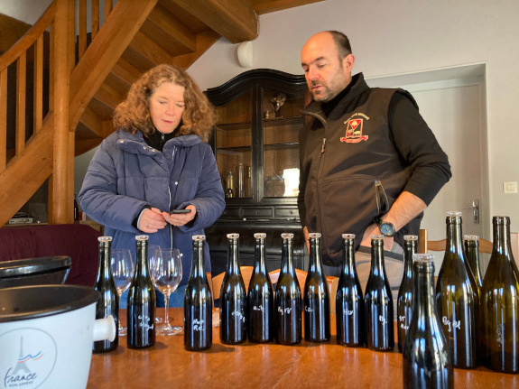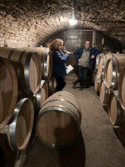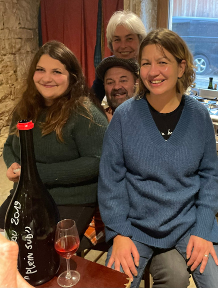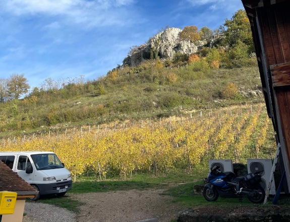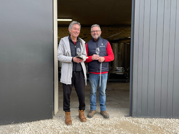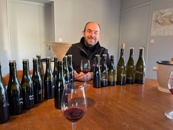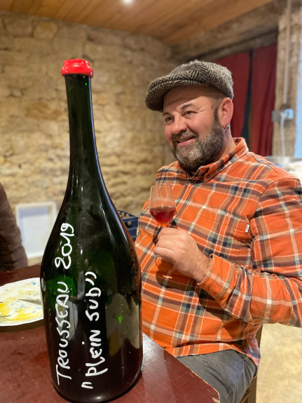 We beginnen in de (eigen) kelder van Maylis, vrouw van Fanfan (J-F), die weliswaar gecoacht door hem, haar eigen (stijl) wijnen maakt onder de naam Zeroïne, dit van in Elzas, Beaujolais en Jura gekochte (biologische) druiven. Met het jaar beter, zoals blijkt uit enkele prille 2022 die we uit het vat proeven. Ondertussen stelt J-F ons voor aan de jonge Jocelyn Broncard die zijn rol in de kelder(s) de komende jaren geleidelijk moet gaan overnemen, een oenoloog eerder werkzaam bij Domaine Rolet in Arbois, hij oogt sympathiek, bescheiden en vooral leergierig. Dat moet ook als tovenaarsleerling.