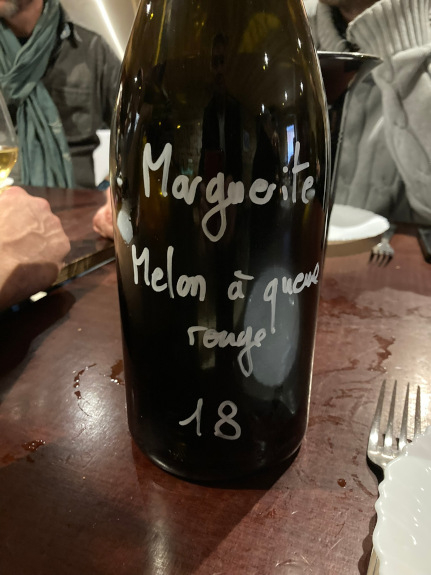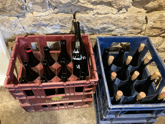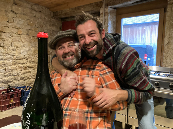 Het loopt inmiddels tegen tweeën, tijd voor het echte flessenwerk, maar dan binnen aan de lange houten tafel waar de houtkachel brandt, de oven gevuld met aardappels in de schil en paar kloeke, te smelten Vacherin Mont d’Or kazen voor de late lunch daarna. We blijven nog even bij rood met eerst weer de wijnen van Zeroïne, maar dan 2021 sinds oktober op fles. GaGa (100% gamay) is opwekkend, fruitrijk, plezierig vegetaal, zoals 2021 betaamt, PiGa (pinot, gamay) is voller, de mooi lichte oranje PiRi (pinot, riesling) serieuzer, complexer. We gaan vrolijk door met rood 2021 van Anne & Jean-François met o.a. La Croix de Bataille; Poulprix; Toute Beauté; Madelon (met 30% syrah dit keer); J’en veux encore ; de rijke (want 2020) Mon Rouge. Van eigen domein maar één rode wijn door ellendige nachtvorstschade, alle (verschillende soorten) druiven van alle perceeltjes (8 hl/ha..), naam: L’Enfant Terrible du Sud, nu al een collectors item, score Revue du Vin de France 95/100… Eindelijk wit dan, een enorme reeks met in het voorprogramma de onderhand bekende Jura-wijnen (Les Cèdres, Les Graviers, Montferrand etc…) van handelshuis, jaargang 2019, na drie jaar opvoeding (hout of amfora) zonder sulfiet op fles. Zie het als de voorlopige line-up van de afspeellijst voorjaar 2023…