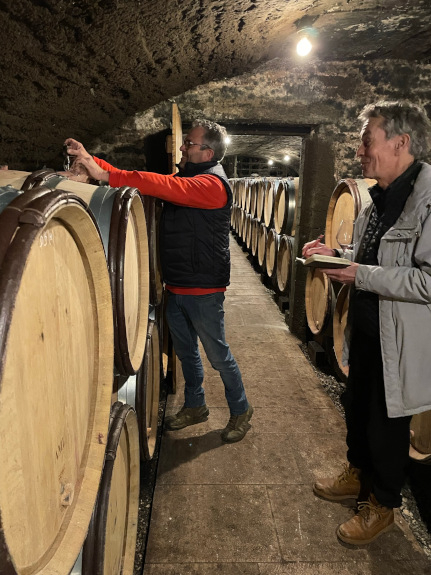 Om 10.30 precies zijn we bij de immer opgeruimde Jean-François en Sophie Germain. Blij met goede, ruime oogst 2022, na qua hoeveelheid dramatische 2021. Gelijk maar de ondergrondse in, daar is het bij uitzondering nu warmer dan buiten, winterjassen kunnen uit. Wat ging er in de Bourgogne mis in 2021? Het laatste weekend maart was het boven de dertig graden, de druivelaars liepen vrolijk uit, te enthousiast, te vroeg, zo bleek paar weken later toen het eerst ging sneeuwen, en de volgende nacht het kwik ver onder nul daalde, bijna alle knoppen stukgevroren, dit keer juist in de hoger gelegen wijngaarden, de 1ers crus, en bij de sneller uitlopende pinot noir-percelen. Na de late (eind september-half oktober) oogst kon de balans worden opgemaakt: 65% verlies bij wit, 75% bij rood….