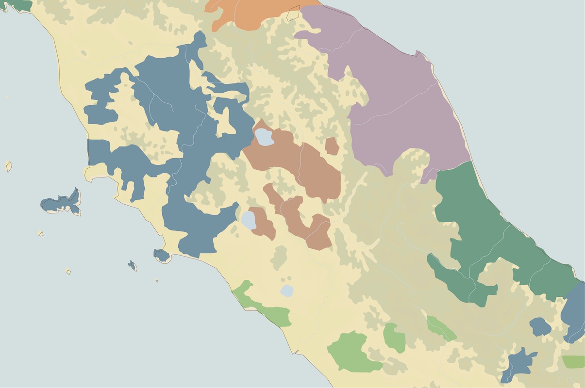 Umbrië, het groene, middelhoge (tot 1200 m) binnenland, tussen Florence en Rome, grenzend aan Toscane, Lazio en de Marken. Ondanks pelgrimsoord Assisi en het bij vakantiegangers zo geliefde Lago Trasimeno een relatief onbekende regio (behalve van aardbevingen), minder hoogdravend, minder chique dan Toscane, zeker wat wijnen betreft. Wandelen, vooruit fietsen kan ook, een must. Een hele dag over eeuwenoude pelgrimspaden lopen van het ene mooie dorpje naar het volgende, nog mooiere, nóg oudere stadje. Marc deed dat in 2014, van Bologna lopend naar Rome…. Denk aan Spelllo, Montefalco, Spoleto, Gubbio, Rieti. Overal: Franciscaanse kloosters….. Grootste stad: Perugia. De keuken is er een van het binnenland, boers en eerlijk. Harde schapenkazen, paddenstoelen (truffels in overvloed, eekhoorntjesbrood) spelt, pasta (strangozzi!), dikke soepen, veel olijfolie, begeleid door eigen stevige, vaak boertig aardse wijnen. De beste komen uit de omgeving van het vestingstadje Montefalco (ga eten bij Ristorante alla Via di Mezzo da Giorgione): Montefalco Rosso van voornamelijk sangiovese en sagrantino (+ zeldzame bianco van grechetto) en de puissant rijke Sagrantino di Montefalco (100% sagrantino), ook in passito versie. Ook steeds betere streekwijnen (IGT) Umbria Rosso, Umbria Bianco waarvoor de regels ruimer zijn en waarbij naast internationale druiven als merlot (doet het aardig hier) er plaats is voor autochtone als ciliegiolo (fijn druifje!), grechetto, trebbiano spoletino, malvasia lunga. Meest bekende wit komt uit Orvieto, maar boeit zelden…