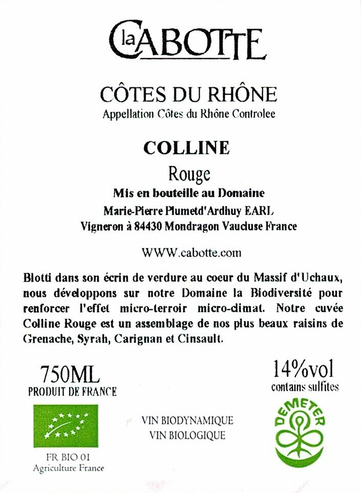 2021 Colline Rouge (grenache, syrah, carignan, cinsault, mourvèdre) minder doorstoofd dan anders, opwekkend kersen, viooltjes, munt, elegant en verteerbaar. Nergens zwaar dankzij die opwekkende zuren, signatuur van de Bourgondiers van La Cabotte.