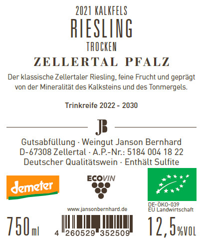Een tuin van Eden het door humorvol, warm, intelligent stel Tine Bernhard en Bernd Pflüger met biodynamische hand bestierde historische Weingut Janson-Bernhard. 2021 Riesling Trocken ‘Kalkfels’ rijpte op oud groot vat. Niet het citroenige van riesling maar fijn gekonfijt fruit, kalk, specerijen, tedere zuren, alom inzetbaar.